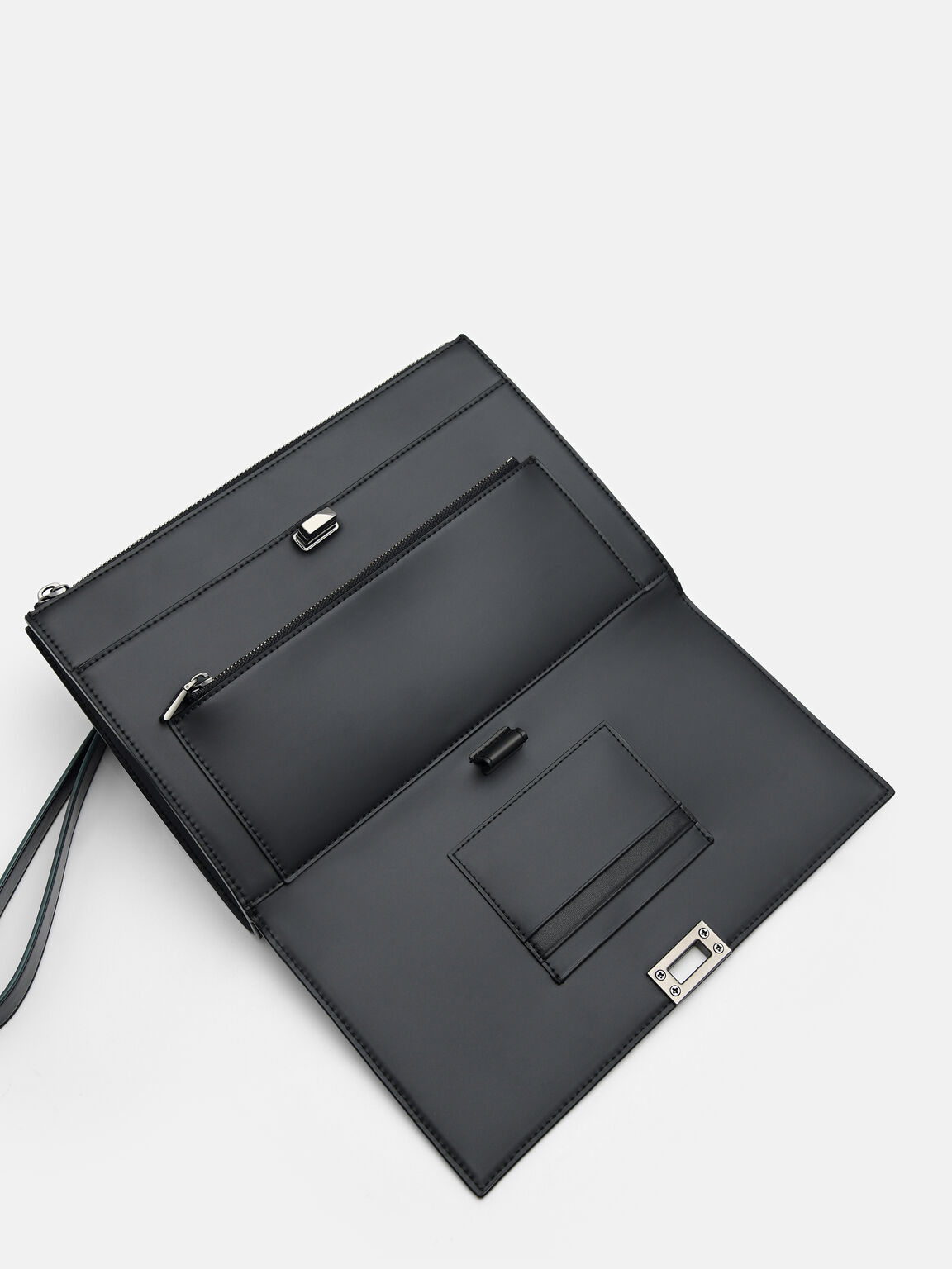 Crafted with clean, contemporary lines, the Edge Clutch Bag in black stands out with its detailed yet understated hardware accents. The zipper closure ensures secure storage of essentials, making it ideal for the discerning modern man on the move. Equipped with a removable wristlet for versatile carrying options, effortlessly complementing a refined and stylish lifestyle.