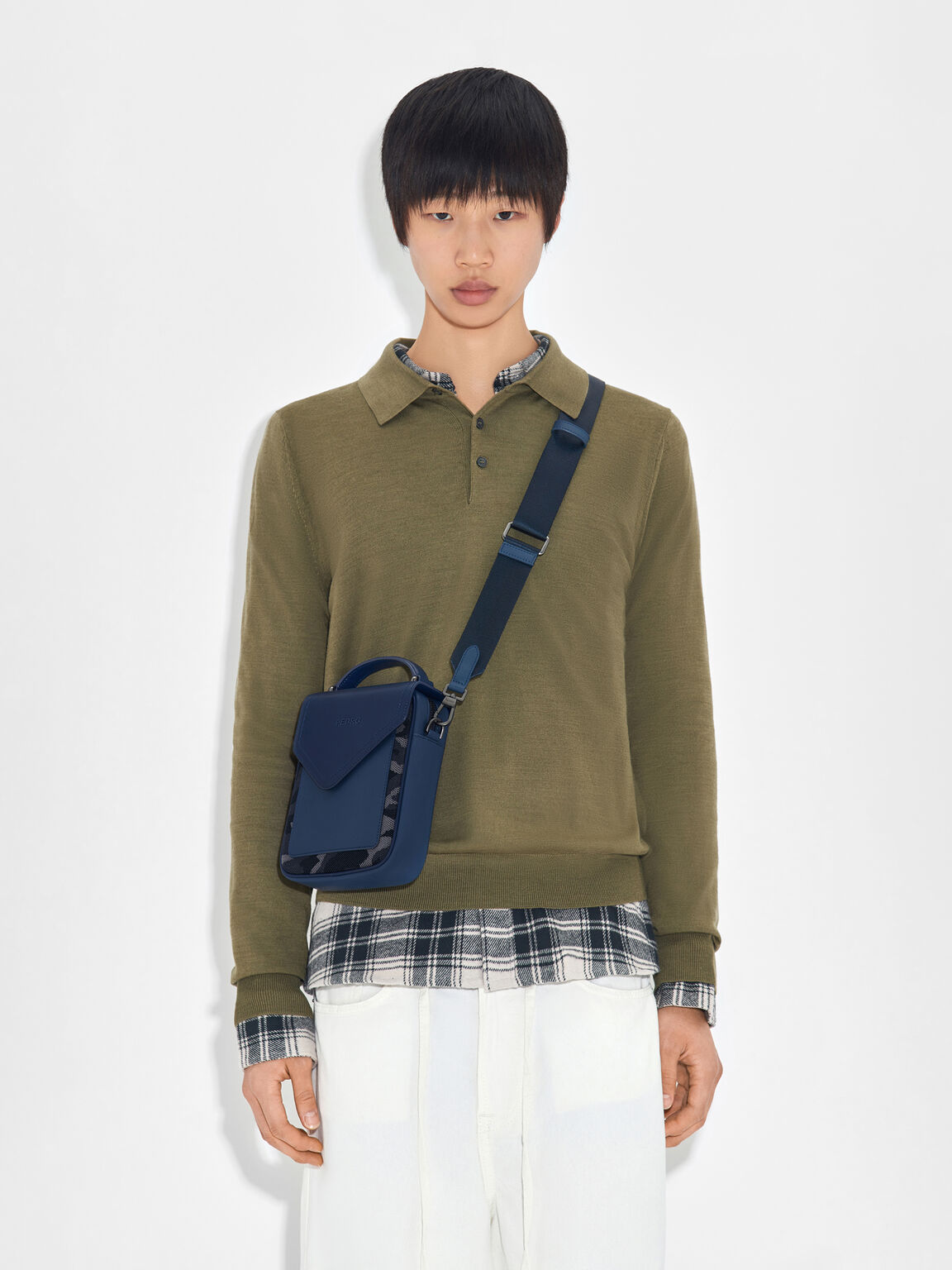 Featuring a distinctive square profile with an asymmetrical envelope flap, exude modern sophistication with the Taper Tall Sling Bag in navy. Its compact size and magnetic closure ensure effortless access to essentials, making it perfect for urban lifestyles. Versatile carrying options include a top handle for hand-carrying and a removable shoulder strap for hands-free convenience.