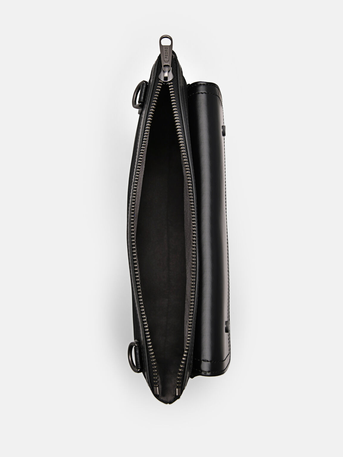 Clutch Kulit Elliott memadukan nilon dan kulit sapi untuk tampilan yang berani. Aksesoris bergaya industrial dan tali yang dapat dilepas membuatnya serbaguna dan bergaya.